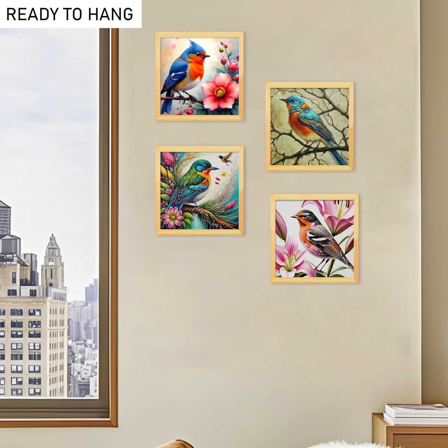 Floral Birds Theme Wall Art, Beautiful Artwork Frame Prints, Textured Posters for Living Room, Bedroom, Home Decor (Wooden- Design 3)